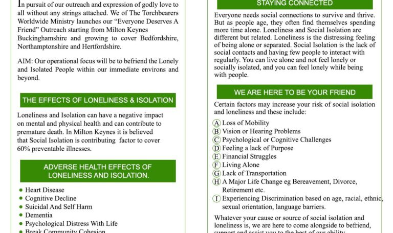 In pursuit of our outreach and expression of godly love to all without any strings attached. We of the Torchbearers Worldwide Minitry laucheds our “Everyone Deserves A Friend” Outreach starting from Milton Keynes Buckinghamshire and growing to cover Bedfordshire, Northamptonshire and Hertfordshire. AIM: Our operational focus will be to befriend the Lonely and Isolated People within our immediate environs and beyond.